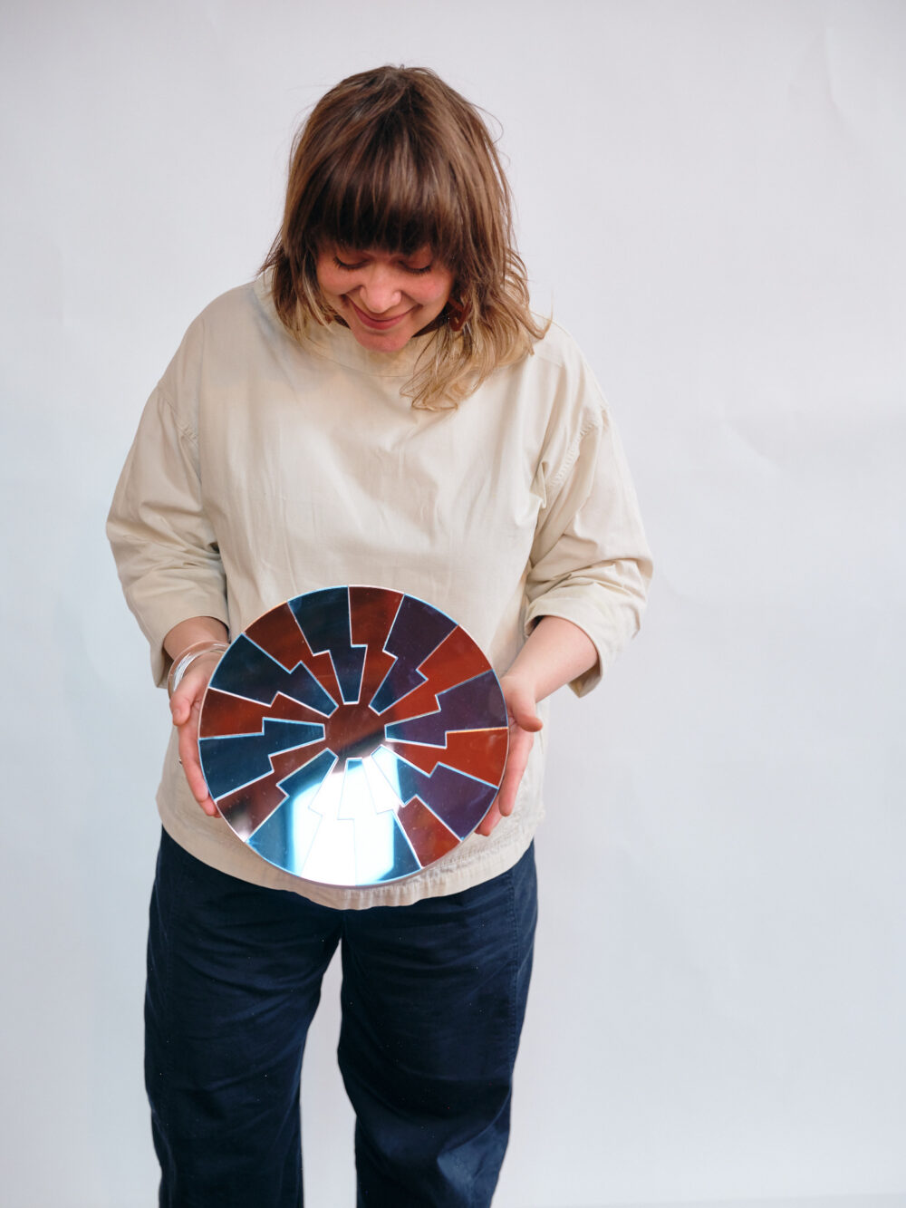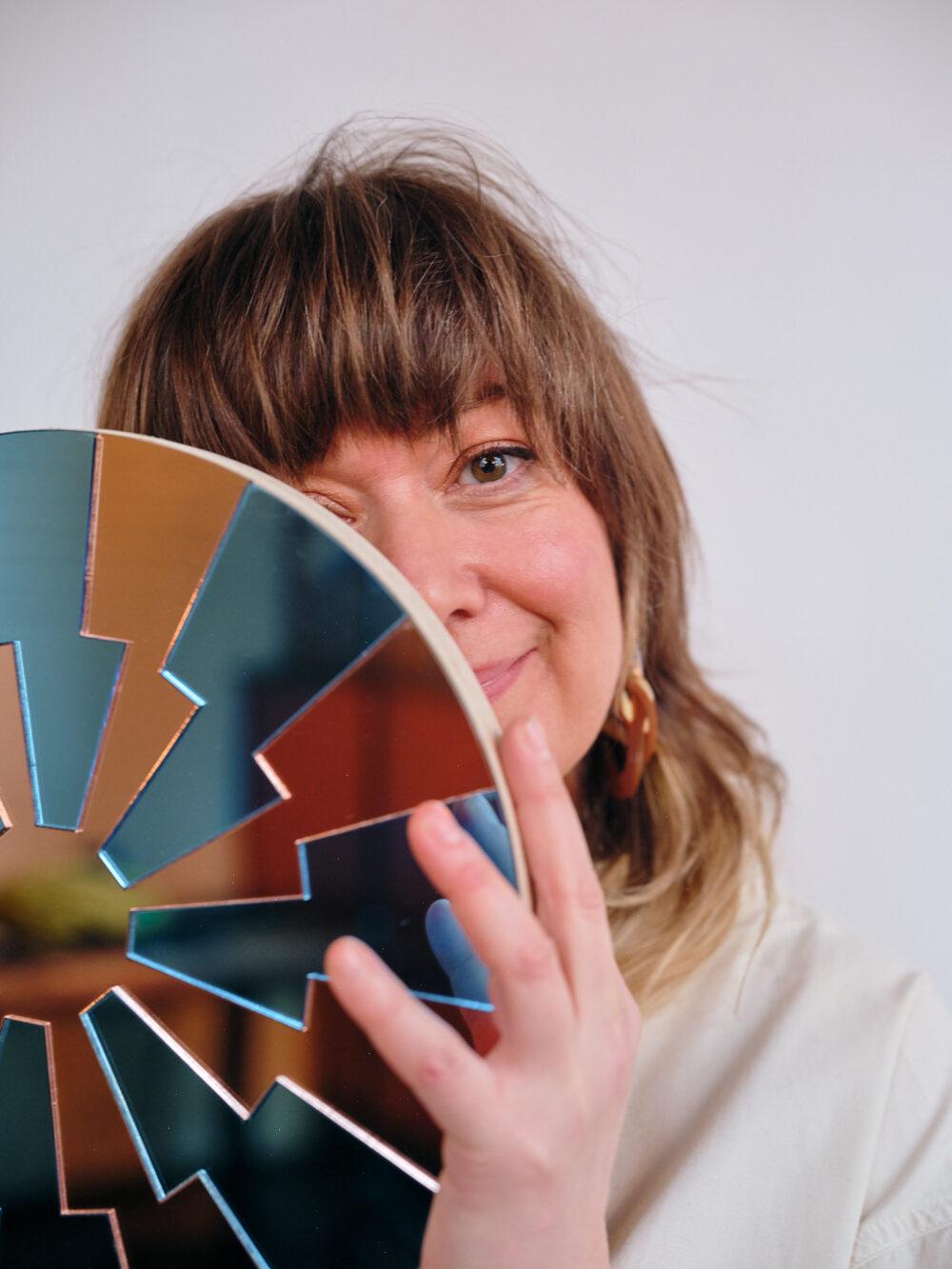 A gorgeous wall mountable mirror design, constructed from gold & baby blue mirrored perspex. Backed onto 18mm plywood with a clever fastner that allows you to hang the mirror easily.
